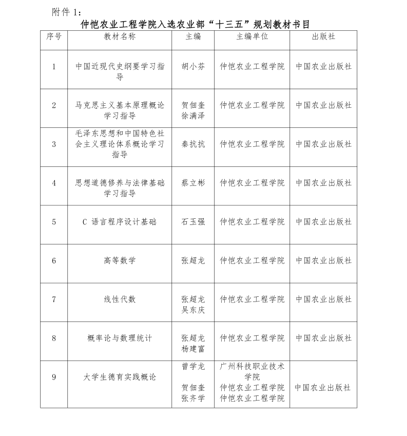 近日从农业部教材办公室获悉,经各有关教育教学单位推荐,农业部教材办公室教材建设专家委员会专家评审和网上公示,仲恺农业工程学院马克思学院五本教材入选农业部“十三五”规划教材书目,分别是胡小芬老师的《中国近现代史纲要》,贺佃奎教授与徐满泽老师的《马克思主义基本原理概论学习指导》,秦抗抗老师的《毛泽东思想和中国特色社会主义理论体系概论学习指导》,蔡立彬教授的《思想道德修养与法律学习指导》,曾学龙教授、贺佃奎教授和张齐学老师的《大学生德育实践概论》。