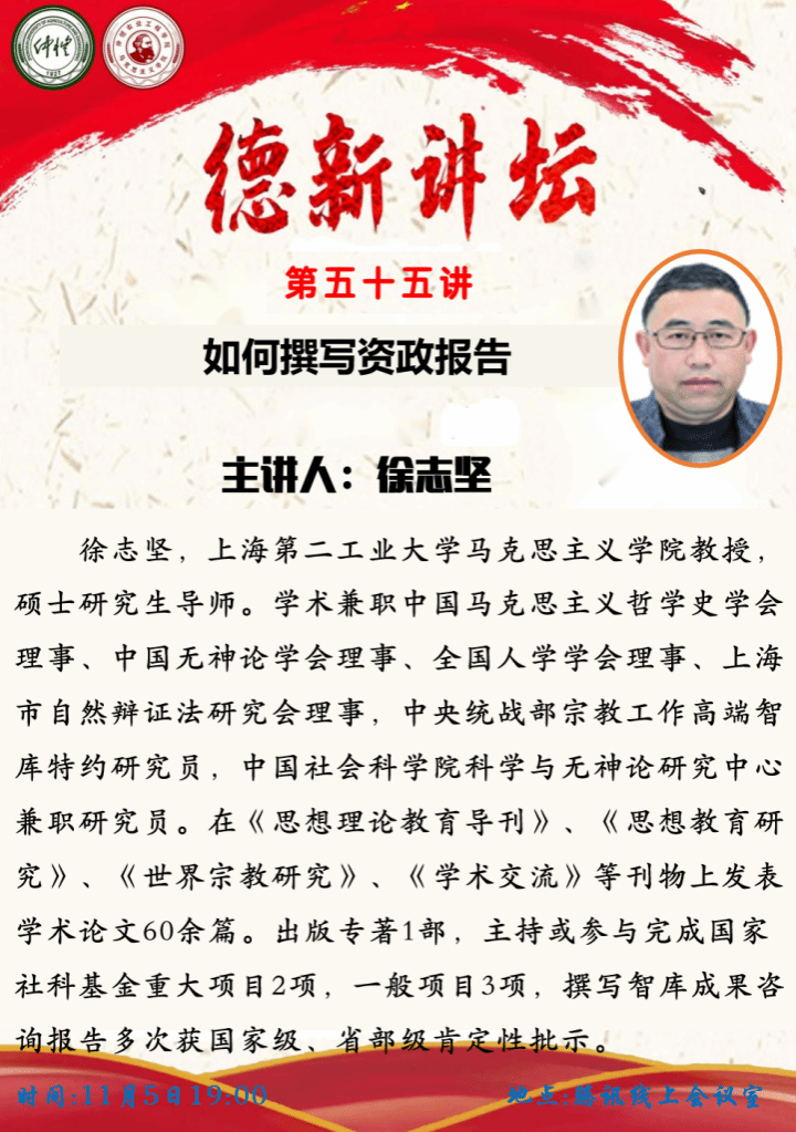 徐志坚教授深耕民族宗教问题研究领域多年,学术履历丰富。他不仅担任中国马克思主义哲学史学会理事、中国无神论学会理事等多项学术兼职,还是中央统战部宗教工作高端智库特约研究员、中国社会科学院科学与无神论研究中心兼职研究员。其研究成果丰硕,已在《思想理论教育导刊》《世界宗教研究》等核心刊物发表论文 60 余篇,出版专著 1 部,主持、参与完成国家社科基金重大项目 2 项、一般项目 3 项,撰写的多篇智库咨询报告获国家级、省部级肯定性批示,具备深厚的理论积淀与实践经验。