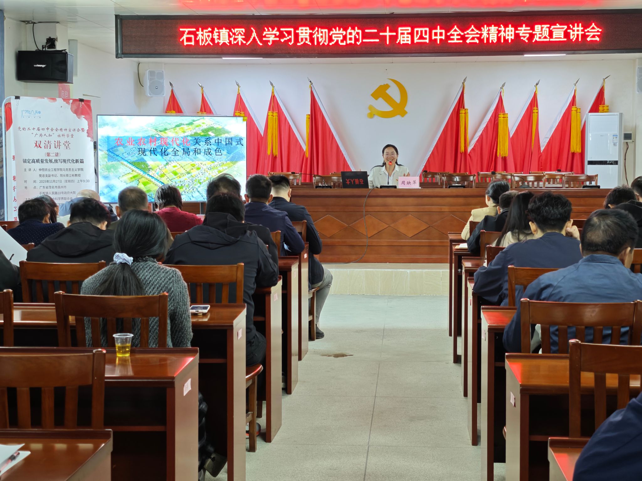 11月25日至27日,由广州市社科联与仲恺农业工程学院联合主办的党的二十届四中全会精神宣讲会在高州市石板镇开讲,仲恺农业工程学院丰满内射白浆视频院长蔡立彬、驻石板镇农村科技特派员周映萍、黄斯龙博士后等先后就不同主题与石板镇党员干部、驻镇帮扶工作队成员等展开研讨,用思政课堂激发发展新动能。