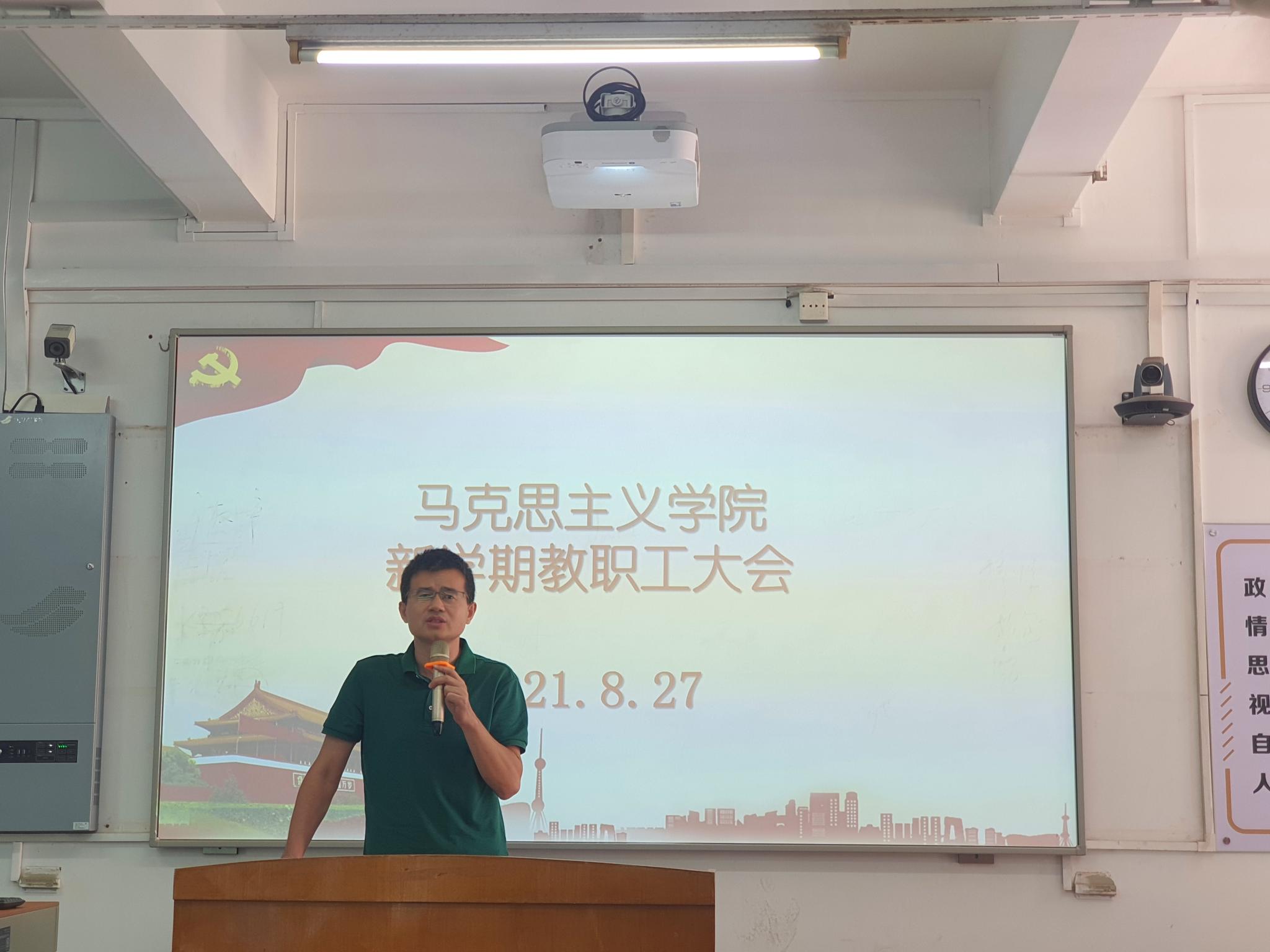 全体教职工大会上,蔡院长首先向大家传达了近期学校召开的几场工作会议精神,并对重点部分进行了解读。然后,蔡院长对学期初的各项工作做出具体的安排:第一要不断提高政治站位,认真做好疫情下的开学准备工作,做好两周甚至一个月的线上教学的预案;第二要狠下功夫,不断提高教学质量和水平,着力打造“理论有深度、情感有温度、实践有力度”的高质量思政金课;第三部署了2021年学院纪律教育月活动,并就当前深入开展党史学习教育做了安排;第四部署了下半年学院主要的行政工作,提出要努力完成今年人才招聘任务。