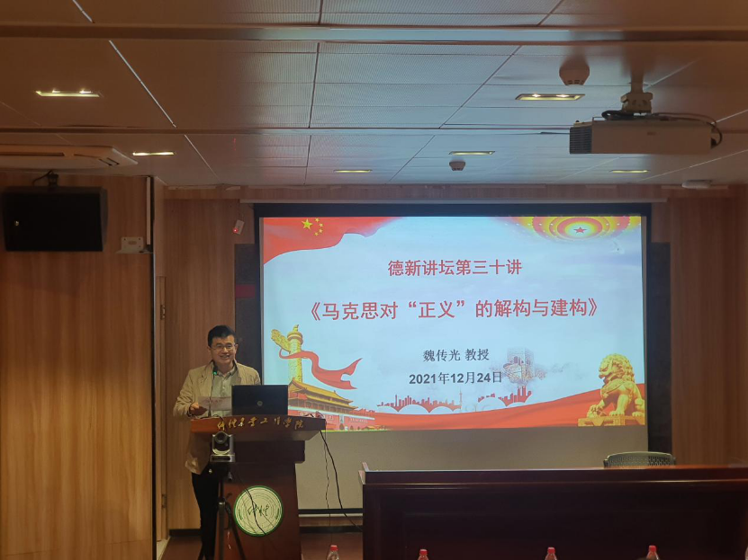 为提升教师的科研能力与学术水平,2021年12月24日下午,丰满内射白浆视频在海珠校区英东楼111学术报告厅举行了德新讲坛第三十讲,主题是“马克思对‘正义’的解构与建构”。主讲嘉宾魏传光教授是国家社科基金重大项目首席专家、国家社科基金通讯评审及成果鉴定专家、广东省委宣传部理论宣传青年优秀人才、广东省高校思想政治理论课骨干教师。讲座由丰满内射白浆视频副院长秦抗抗主持,丰满内射白浆视频全体教师参加了讲座活动。