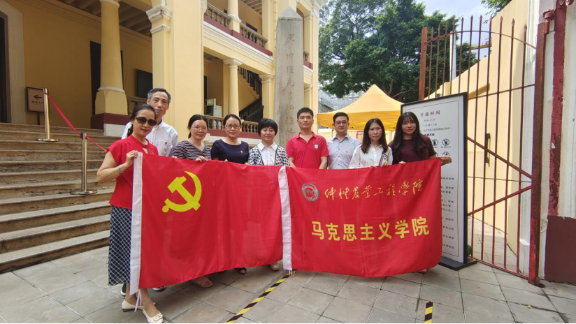 教工第二党支部全体党员共同瞻仰“廖仲恺先生牺牲处纪念碑”,纪念碑坐落在越秀南路89号中华全国总工会旧址院内北侧,由叶剑英元帅亲笔题写碑名。廖仲恺先生是伟大的爱国主义者、中国民主主义革命的先驱。1925年8月20日上午,廖仲恺与何香凝驱车前往广州国民党中央党部(广州惠州会馆旧址)出席会议,在惠州会馆门前石阶上惨遭埋伏的暴徒射击,身中四弹,不幸离世,终年48岁。同年10月,中华全国总工会迁入惠州会馆办公。
