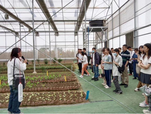 上午支部前往增城幸福田园蔬菜产业园。该园区是国务院扶贫办全国贫困村创业致富带头人(幸福田园)实训基地。在幸福田园蔬菜产业园,党员们主要参观了有机蔬菜种植大棚、中科优格快繁产业基地等。在有机蔬菜种植大棚里,现场解说人员重点介绍了“五零生机蔬菜”,“五零”是指“零农药、零污染、零化肥、零重金属、零激素”,之所以实现“五零”是由于采用被联合国确认为全球唯一的仿生农业科技“天癒农法”种植形成。这一技术秉持“遵循天道、顺应自然、回归自然”的理念。老师们一边参观一边赞叹幸福田园蔬菜产业园,切身感受到科技赋能现代农业发展的魅力。