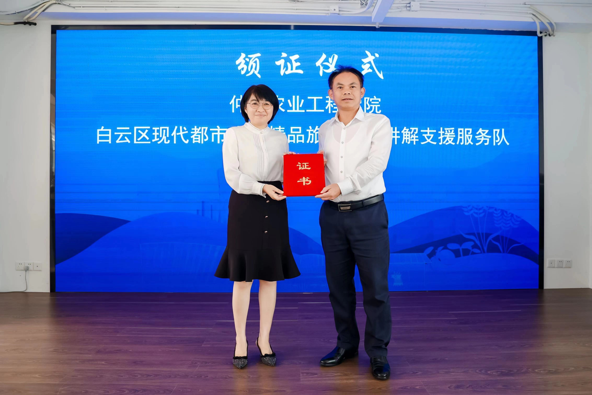会上,白云区农业农村局为白云区三个现代都市农业精品旅游资源点——钟落潭镇沙田村、广州种业之都启动区、百兴穗香邨颁证,为仲恺农业工程学院颁发白云区现代都市农业精品旅游志愿服务队证书,来自仲恺农业工程学院的志愿者们即将走入展馆、深入田间,为游客朋友提供志愿讲解服务,为乡村振兴注入青年力量,打造大学生“百千万工程”突击队。