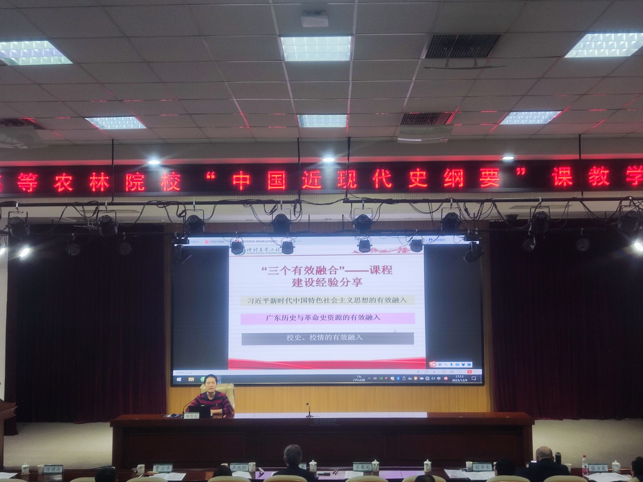 在经验交流环节,杨智文受邀作了题为《省级一流课程建设经验》的发言,介绍了我校丰满内射白浆视频纲要教研室在建设广东省课程思政改革示范项目中总结的“三个有效融合”的相关经验,即与习近平新时代中国特色社会主义思想有效融合;与广东省和广州市革命历史文化有效融合;与仲恺农业工程学院作为纪念性大学和农业院校特色有效融合。在发言中,杨智文分享了如何利用广东省的革命红色文化资源以及校史资源推动教材体系向教学体系转化。他的发言得到了与会专家的一致好评。