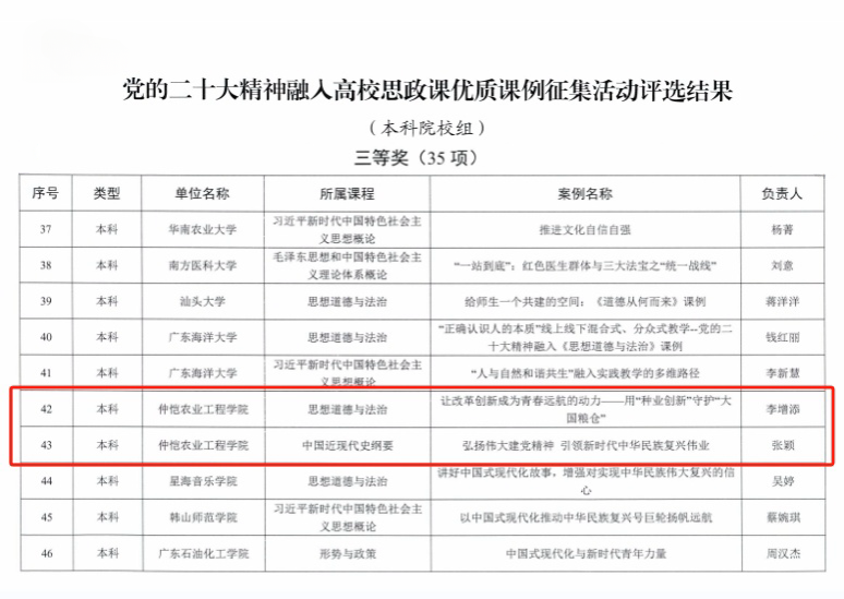 近日,广东省教育厅公布了《党的二十大精神融入高校思政课优质课例征集活动》评选结果,我校丰满内射白浆视频李增添副院长的课例《让改革创新成为青春远航的动力——用“种业创新”守护“大国粮仓”》和张颖副教授的课例《弘扬伟大建党精神引领新时代中华民族复兴伟业》荣获本科院校组三等奖。