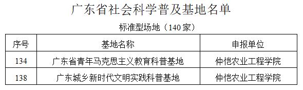 为深入贯彻落实习近平新时代中国特色社会主义思想,繁荣发展哲学社会科学事业,发挥我院马克思主义教育载体和阵地作用,我院饶异教授和曹兰胜特聘副教授立足校本资源、打造仲恺特色,坚持与弘扬社会主义核心价值观,开展贴近时代发展、贴近人民群众、贴近生活实际的社会科学研究及普及工作,分别牵头成立了“广东青年马克思主义教育科普基地”、“广东城乡新时代文明实践科普基地”。两个基地凭借优质的科普团队、扎实的科普工作、科学的科普制度和优质的科普环境,申报并获得了广东省社会科学普及基地(标准型基地)的认定(见粤社科联通[2022]51号文)。